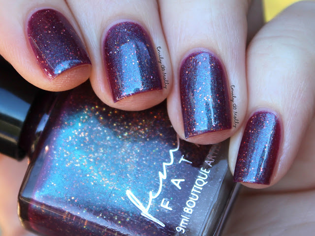 Description - This is described as a strong plum-magenta jelly base, with turquoise flash and golden holo glitters